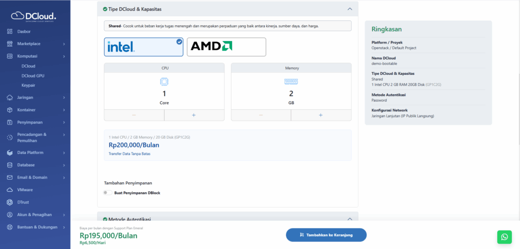 - Pada bagian Tipe DCloud dan kapasitas, pengguna dapat menentukan tipe DCloud dan kapasitas sesuai kebutuhan.