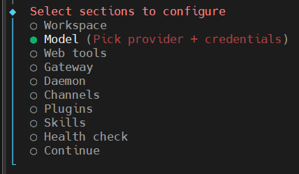 OpenClaw Configure - Setup Model: Pilih menu Model untuk menghubungkan OpenClaw dengan model AI Anda.