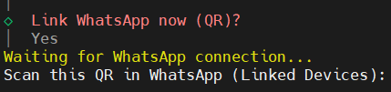 Konfigurasi WhatsApp - Scan WhatsApp: Buka WhatsApp, navigasi ke Settings > Linked Devices > Link a device, lalu pindai QR Code yang muncul di terminal.