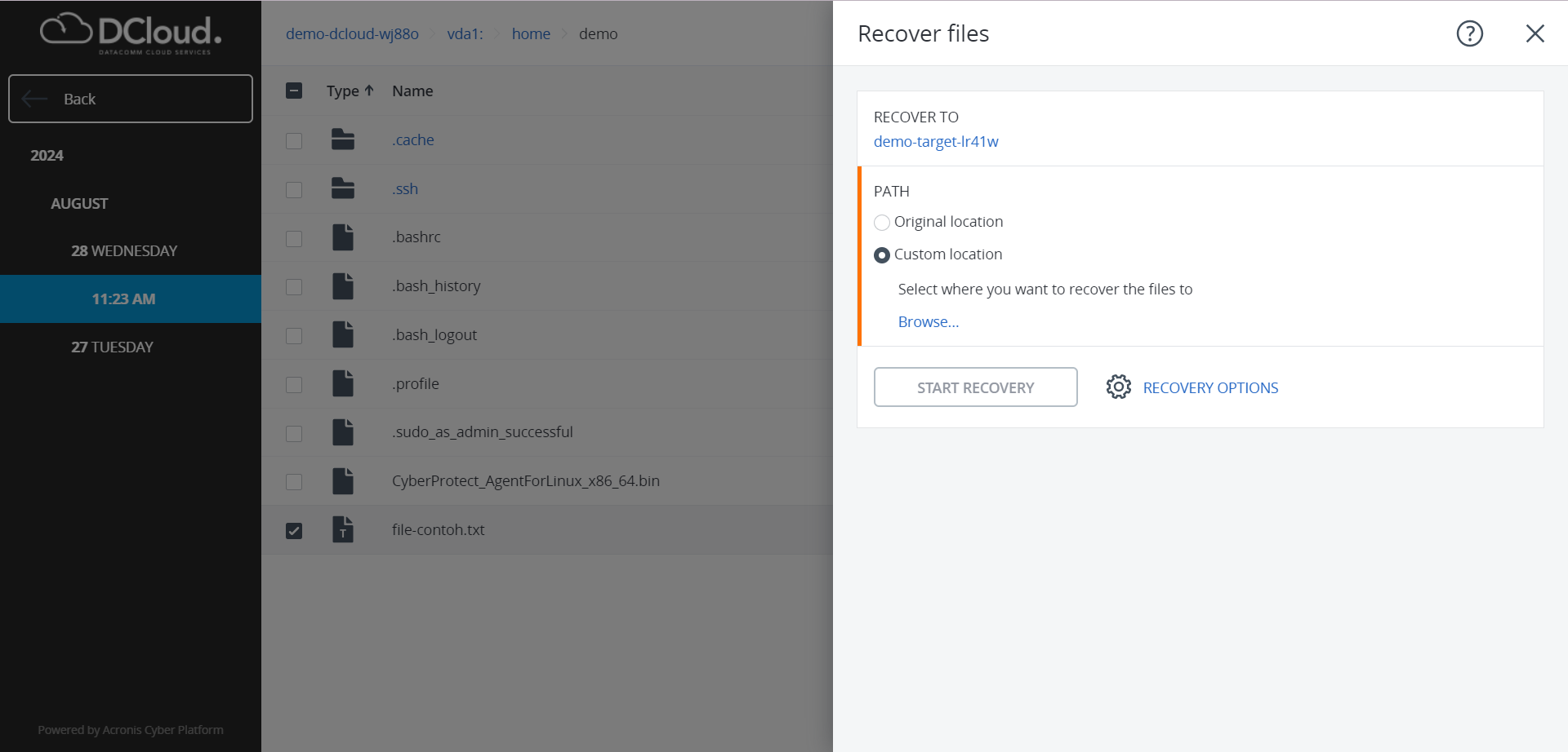 Restore data merupakan proses penting untuk memulihkan informasi yang hilang atau rusak akibat berbagai kejadian tidak terduga. Acronis Backup menyediakan fitur pemulihan file ke mesin virtual yang sedang aktif (existing VM) maupun ke mesin virtual baru sebagai target. Apabila akan melakukan pemulihan file ke mesin target diharuskan telah menginstall agen Acronis dan terdaftar pada tenant atau project yang sama dengan mesin virtual yang akan menjadi sumber data yang dipulihkan. Untuk melakukan restore file ke existing VM atau ke VM lain, silakan lakukan langkah-langkah berikut: