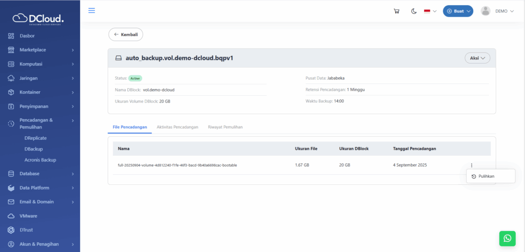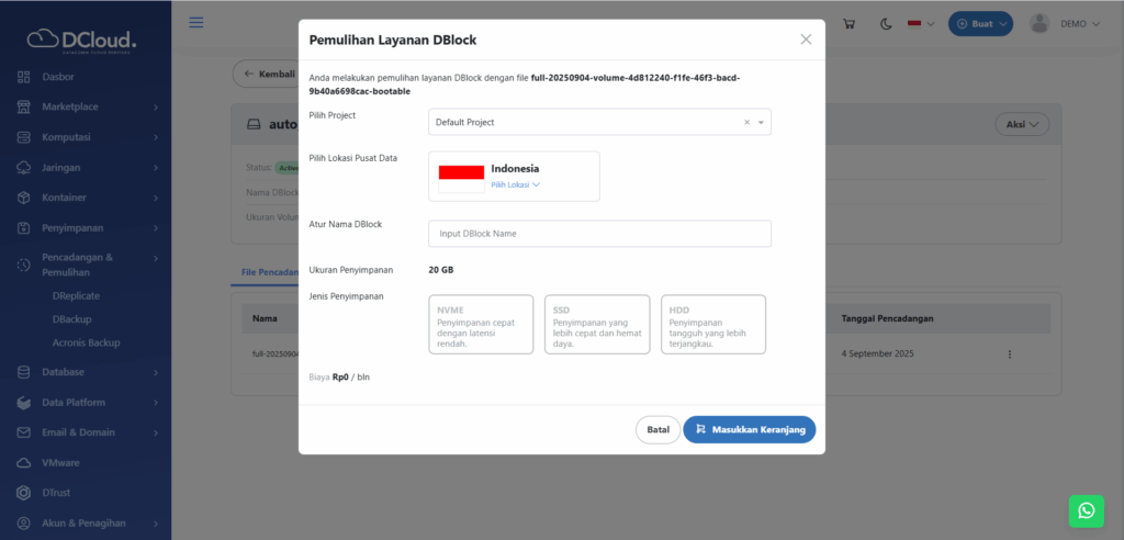 Pemulihan digunakan untuk mengembalikan data yang telah dicadangkan melalui layanan DBackup. Proses pemulihan pencadangan akan dikenakan biaya tambahan. Data yang berhasil dipulihkan akan tersedia pada menu DBlock. Untuk memulai proses pemulihan, silakan ikuti langkah-langkah berikut: