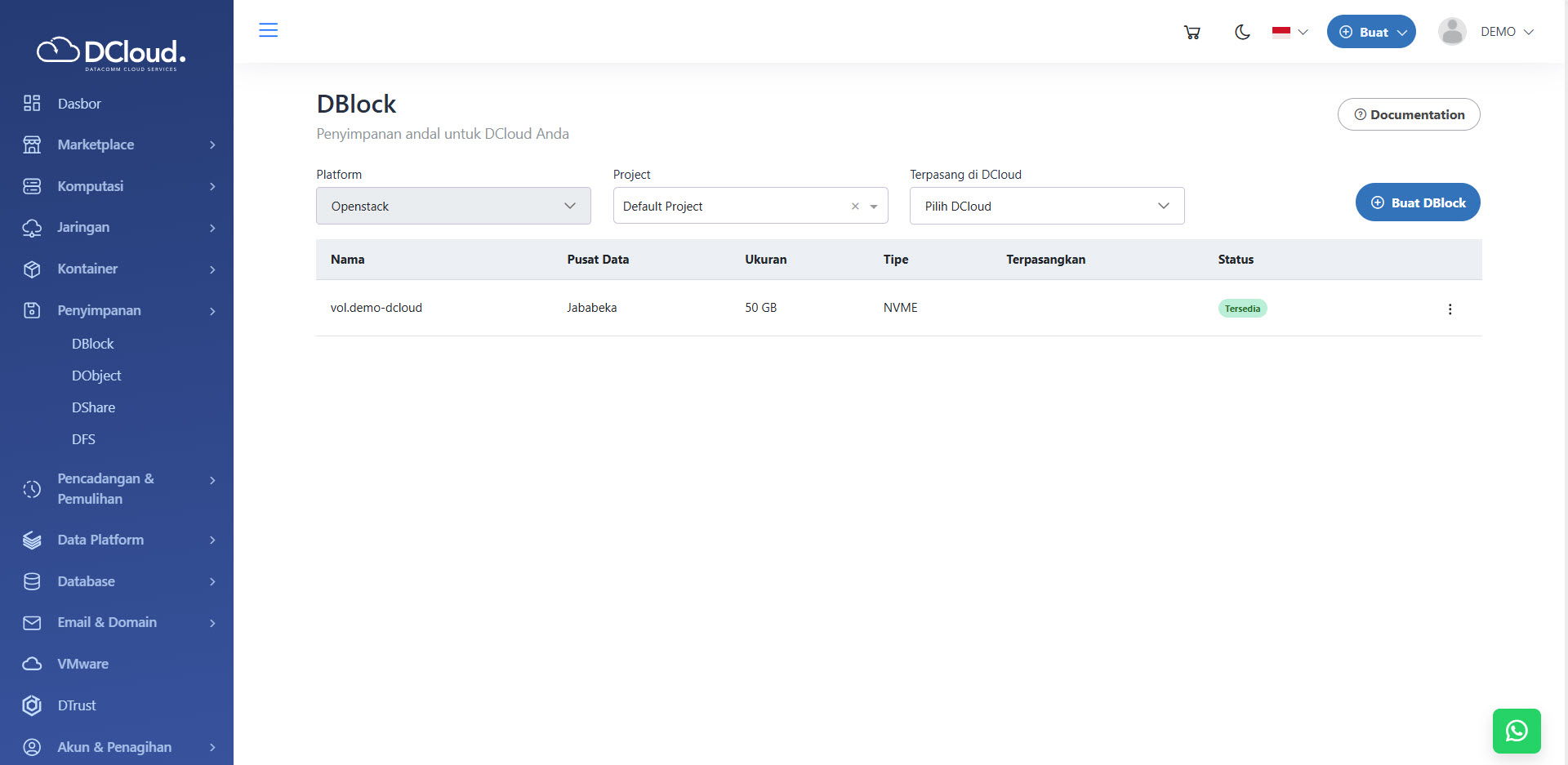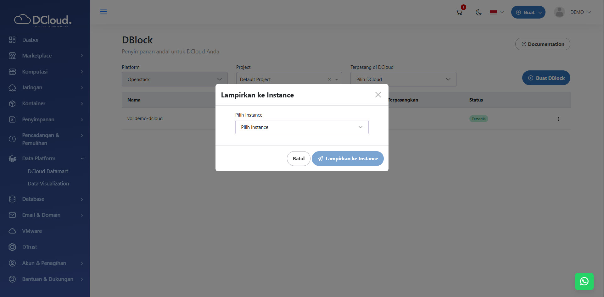 Penting untuk diperhatikan: Agar volume dapat dilampirkan, volume DBlock harus dalam status tersedia, yang berarti volume tersebut saat ini tidak terhubung (detached) dengan instance DCloud lain. Selain itu, volume DBlock tidak boleh berupa Bootable Volume saat akan dilampirkan sebagai penyimpanan data tambahan.