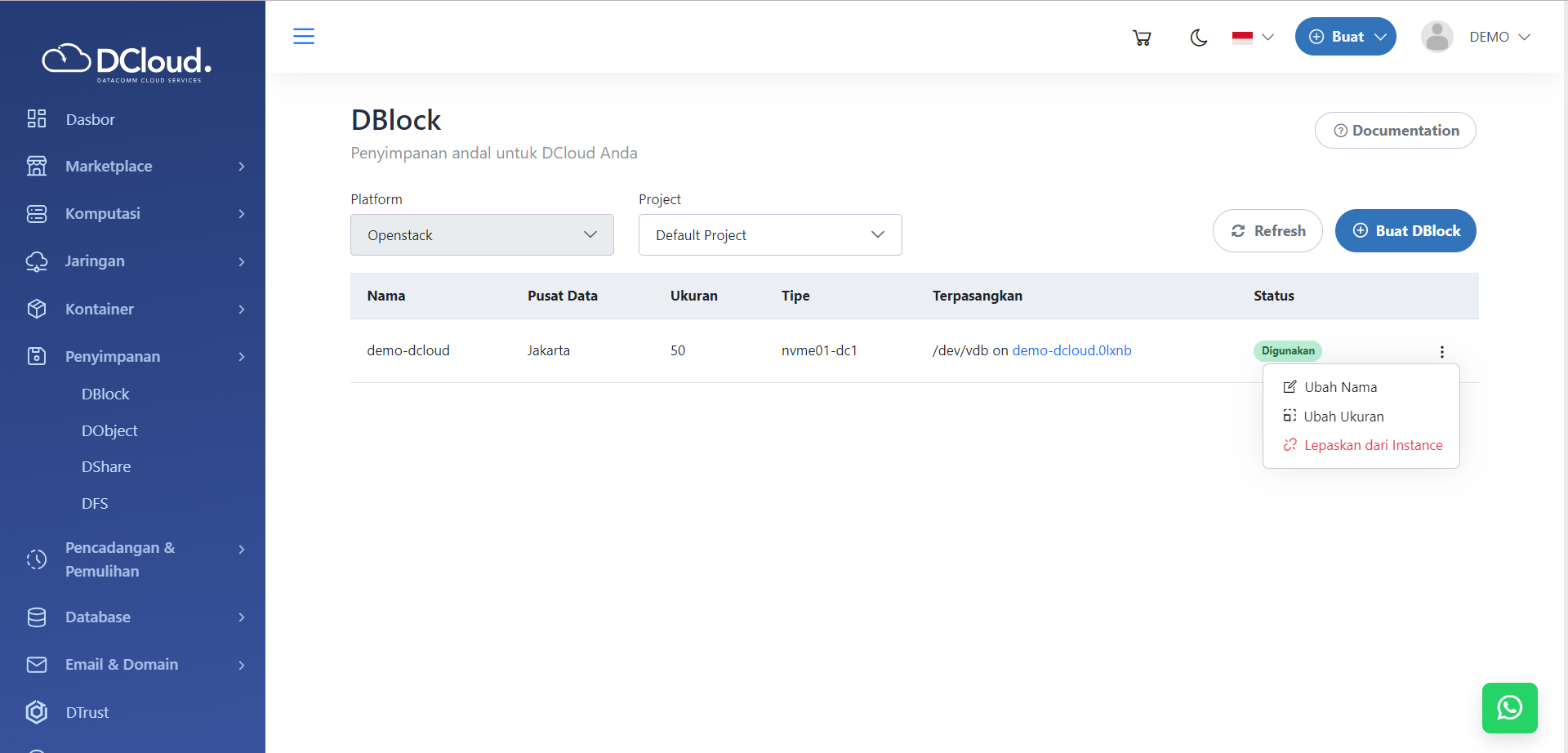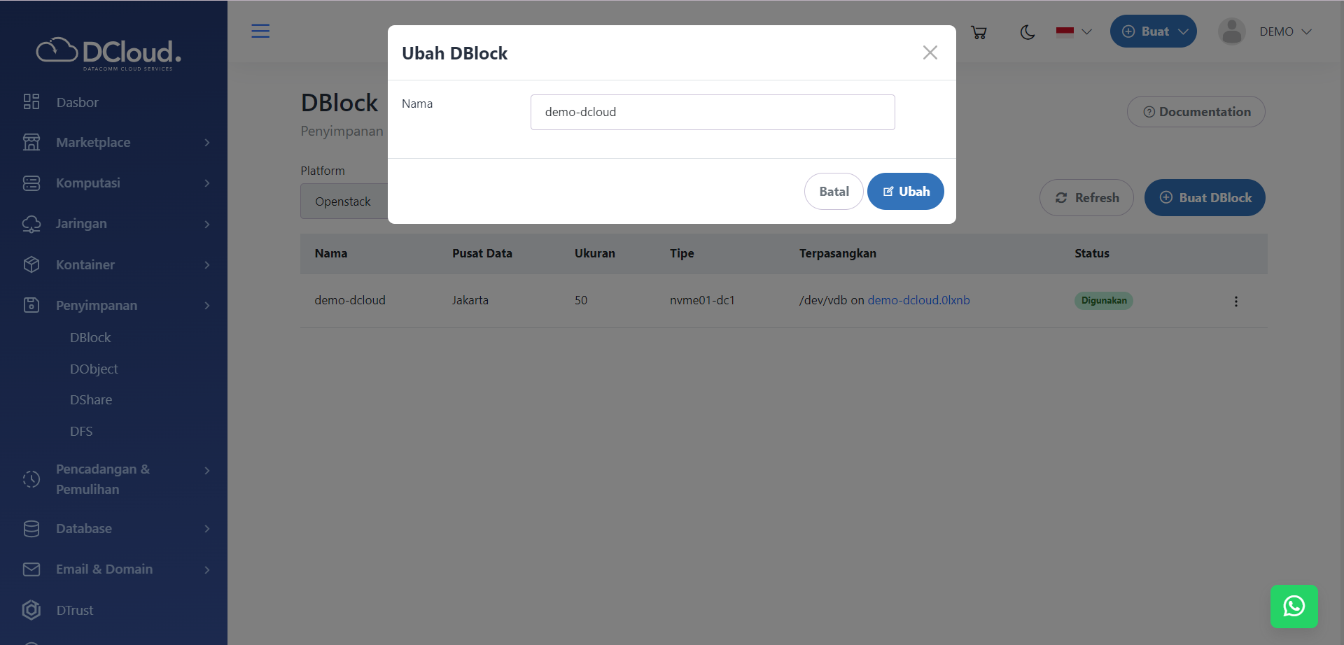 Ubah Nama DBlock (Volume) merupakan bagian dari kelola volume DBlock yang Anda miliki. Sebelum memulai, pastikan Anda memiliki akun DCloud dan telah masuk ke Customer Portal DCloud. Untuk mengubah nama DBlock, berikut langkah yang bisa dilakukan.