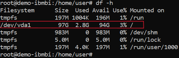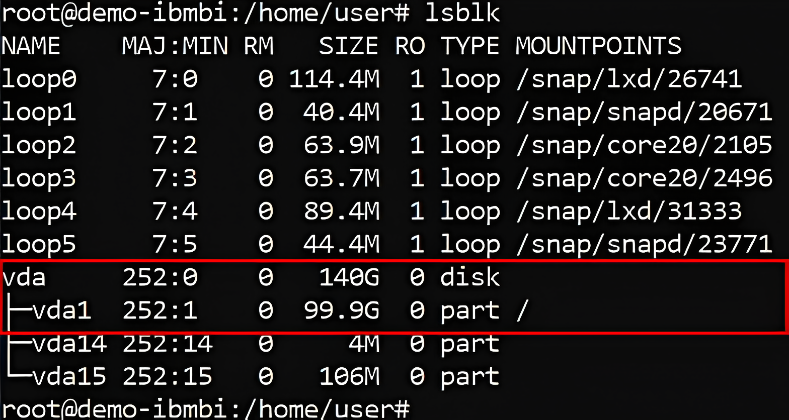 - Pada gambar di atas, terdapat disk vda dengan ukuran 140 GB dan partisi vda1 dengan ukuran 99.9 GB.