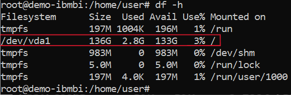 - Pada gambar di atas, status directory / pada mount point /dev/vda1 belum bertambah, Anda dapat menjalankan perintah berikut untuk memastikan directory / pada mount point /dev/vda1 bertambah menjadi 140 GB.