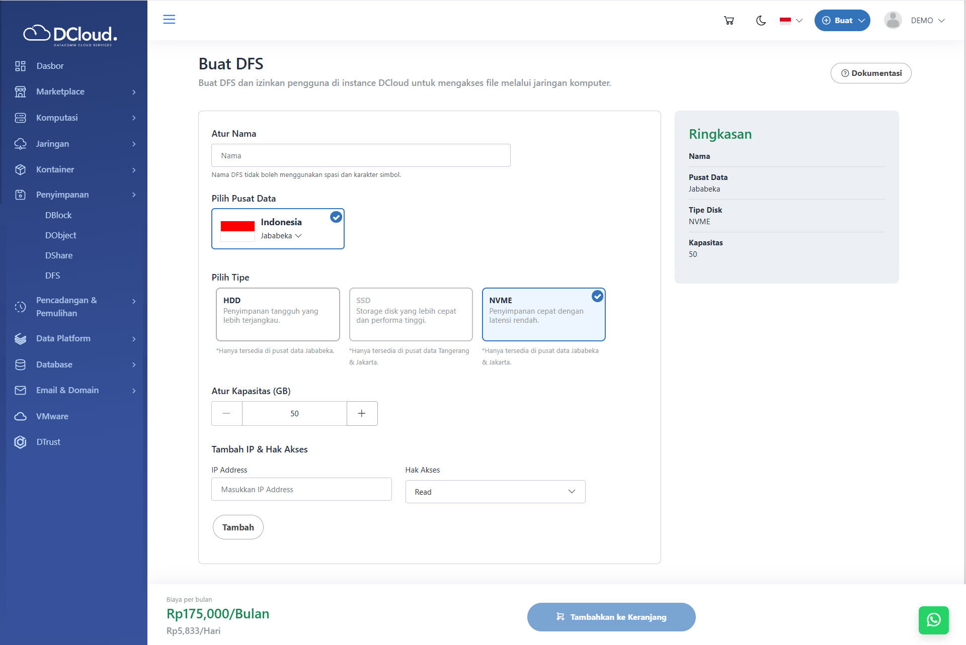 - Tentukan Ukuran Volume (GB) yang ingin dibuat. Ukuran DFS saat ini minimal 50 GB dan maksimal 10000 GB.