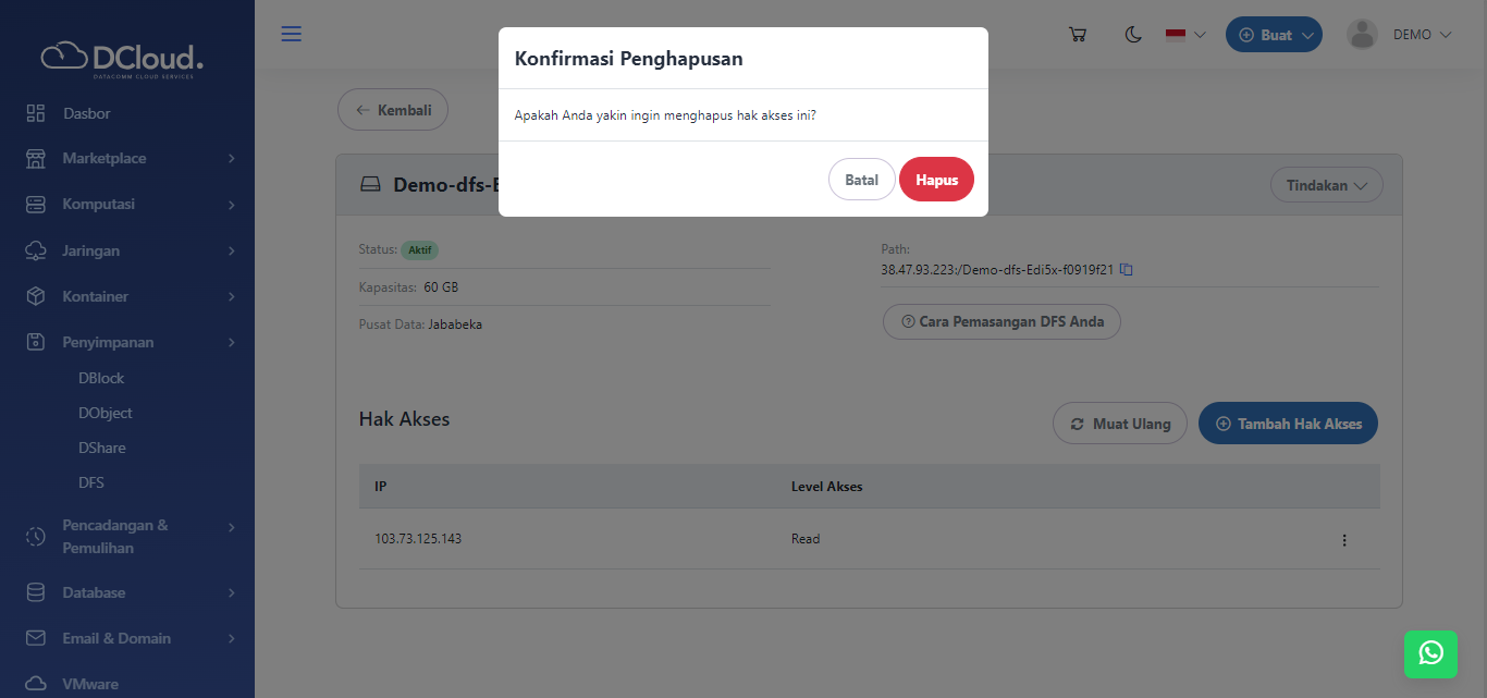Hapus hak akses digunakan untuk menghapus hak akses yang tidak lagi digunakan. Untuk melakukan hapus hak akses DFS, silakan lakukan langkah-langkah berikut: