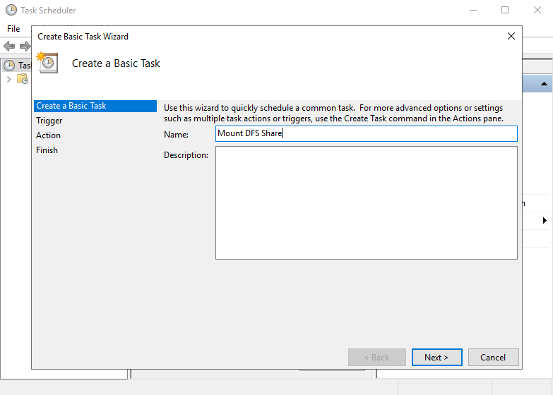 - Kemudian akan muncul halaman Wizard. Pada bagian Create a Basic Task masukkan Nama yang diinginkan untuk tugas tersebut, misalnya “Mount DFS Share”. Apabila data sudah terisi seluruhnya dapat menekan tombol Next.