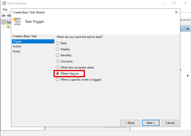 - Pada bagian Trigger, pilih When I log on (ketika saya masuk), lalu klik tombol Next.