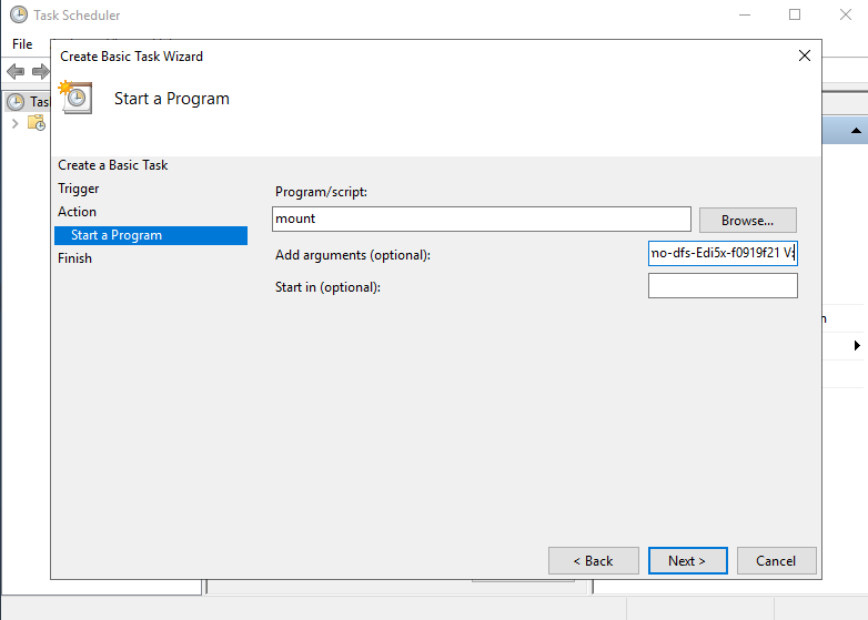 Jika Anda ingin agar direktori DFS tetap terpasang setelah komputer di-restart atau dimatikan, Anda perlu melakukan konfigurasi pemasangan DFS secara permanen. Proses ini dapat dilakukan dengan memanfaatkan Task Scheduler, silakan ikuti langkah-langkah berikut ini.