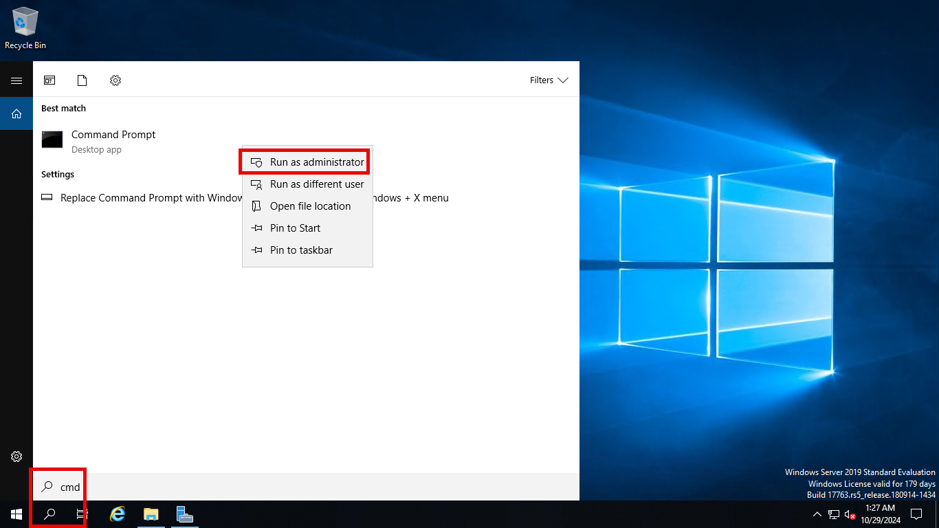 - Membuka Command Prompt (CMD) dengan hak akses Administrator dengan cara ketik cmd pada kotak pencarian Windows, kemudian klik kanan pada hasil pencarian dan pilih Run as administrator.