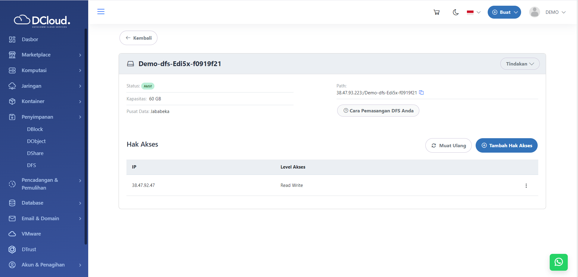- Pastikan memiliki layanan DCloud File System (DFS) yang sudah aktif dan alamat IP dari instance Windows di DCloud telah ditambahkan ke dalam konfigurasi DFS agar instance dapat mengakses layanan DFS tersebut.