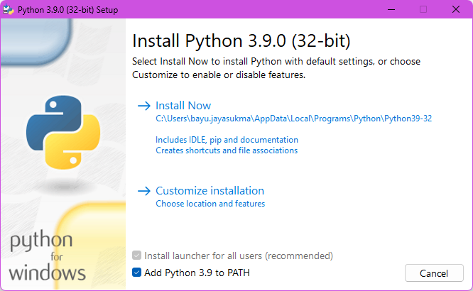 - Setelah proses pengunduhan selesai, jalankan installer python-3.9.0.exe. Selanjutnya jendela installer akan terbuka secara otomatis. Ikuti langkah-langkah instalasi berikut: