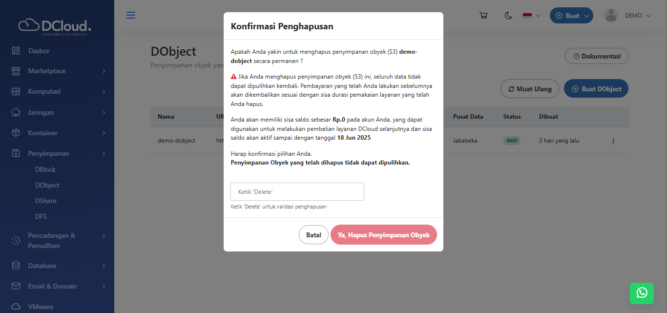 - Sebagai catatan apabila layanan pengguna dihapus, maka pengguna akan mendapatkan sisa saldo yang bisa digunakan untuk melakukan pembelian layanan DCloud yang lain.
