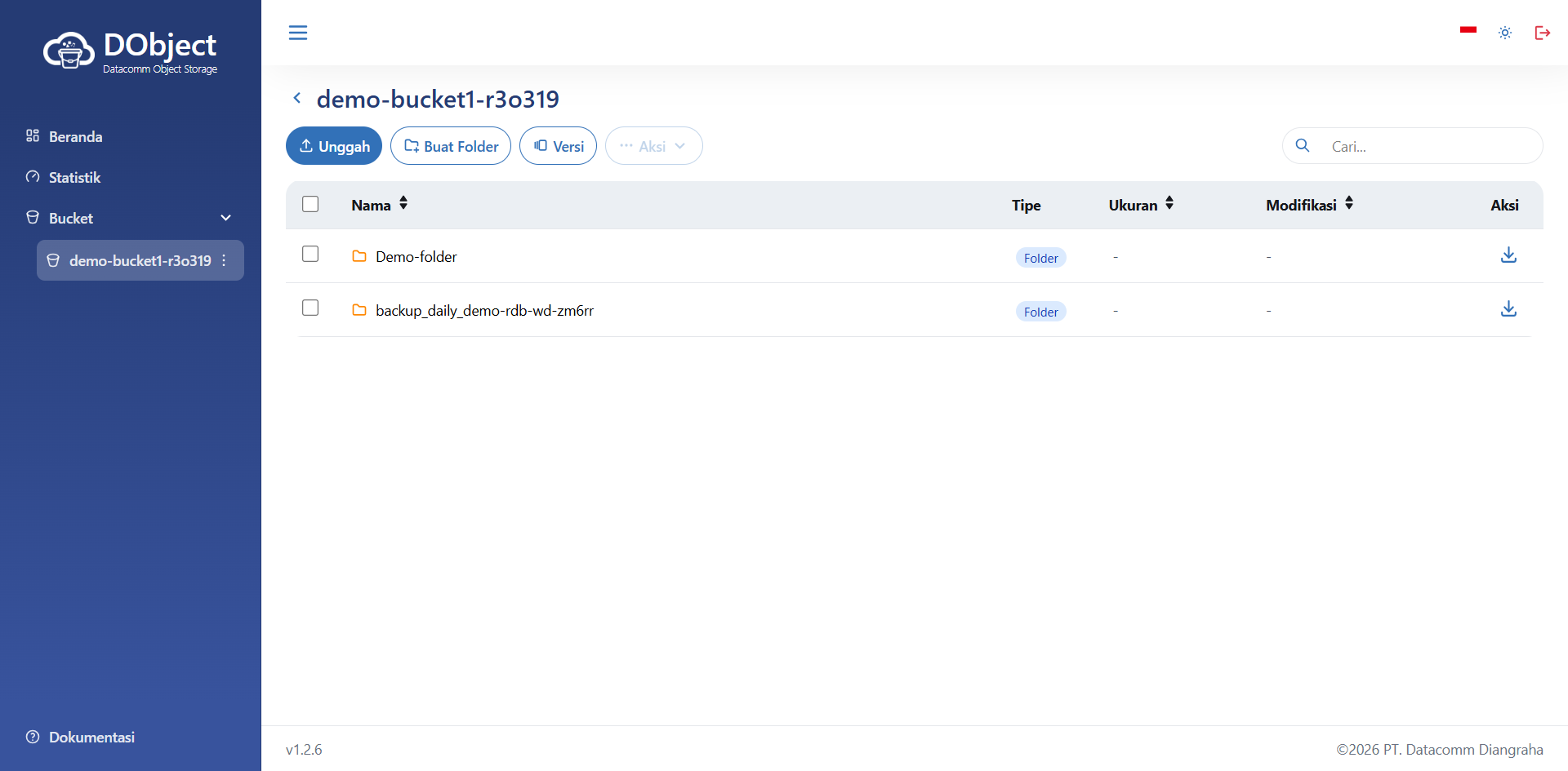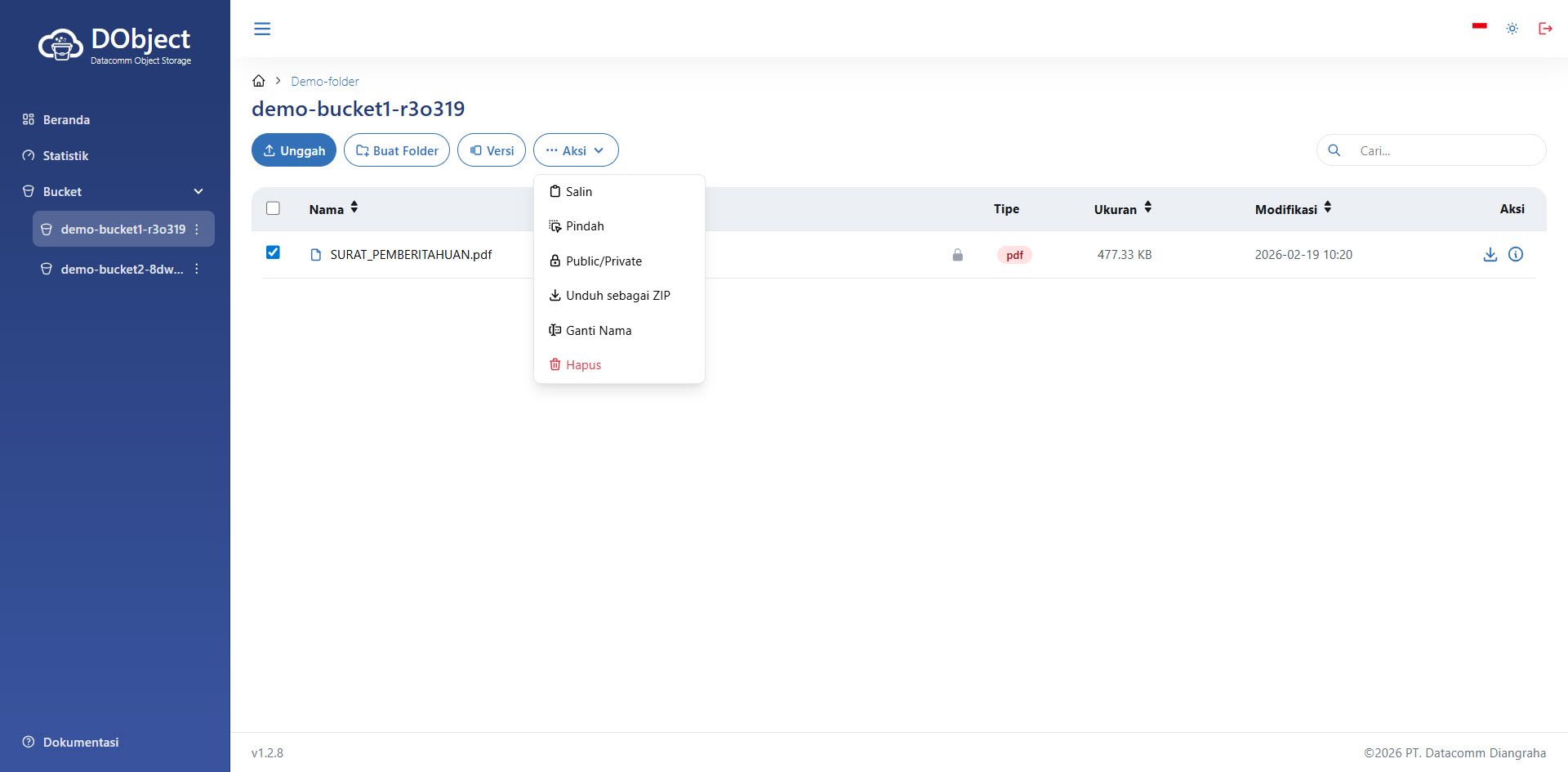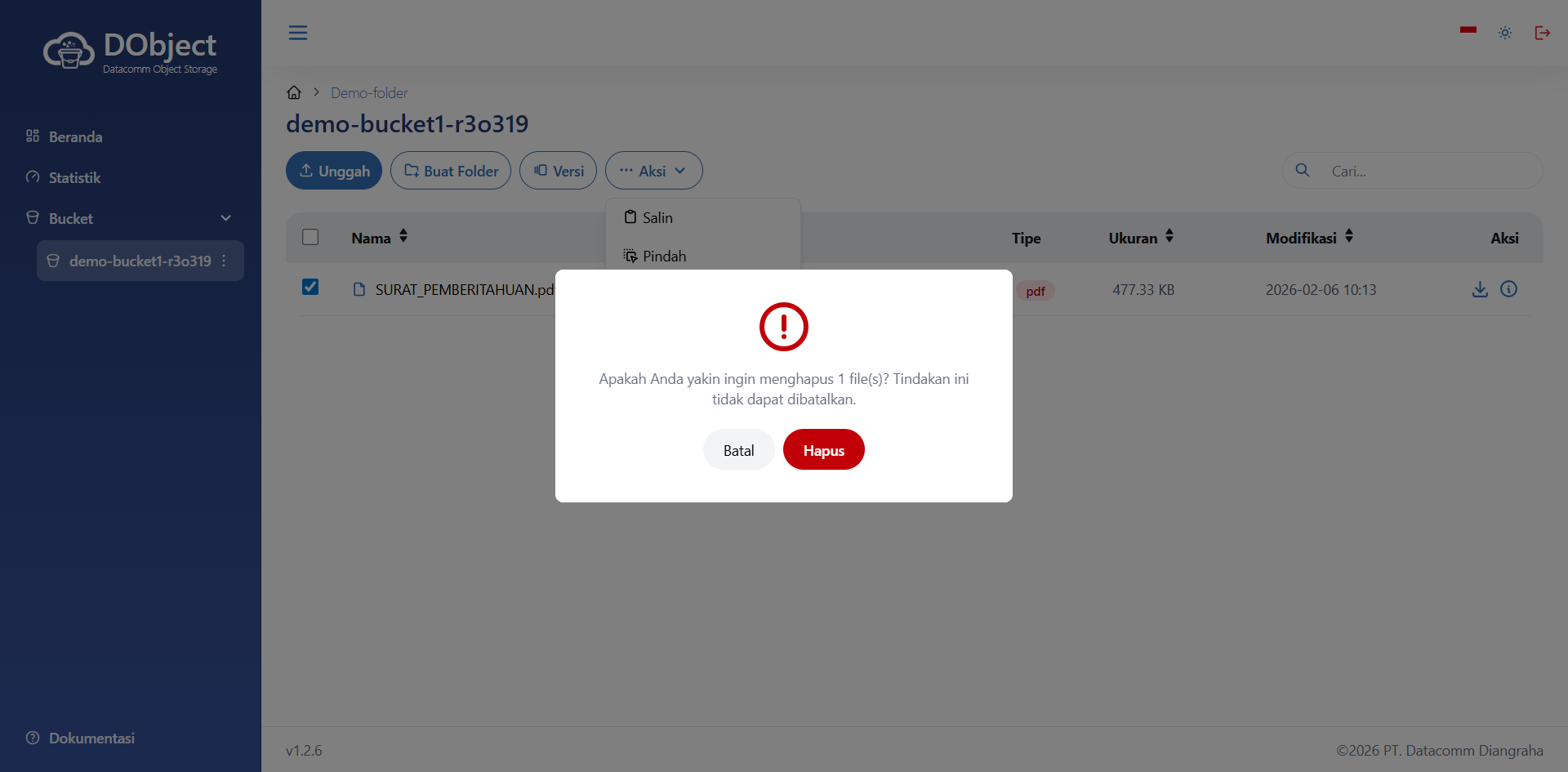 Halaman Detail Bucket - Anda dapat melakukan hapus dengan memberi tanda centang pada kotak disamping nama Folder maupun berkas yang diinginkan. Kemudian tekan tombol Aksi, akan tampil halaman seperti di bawah ini.