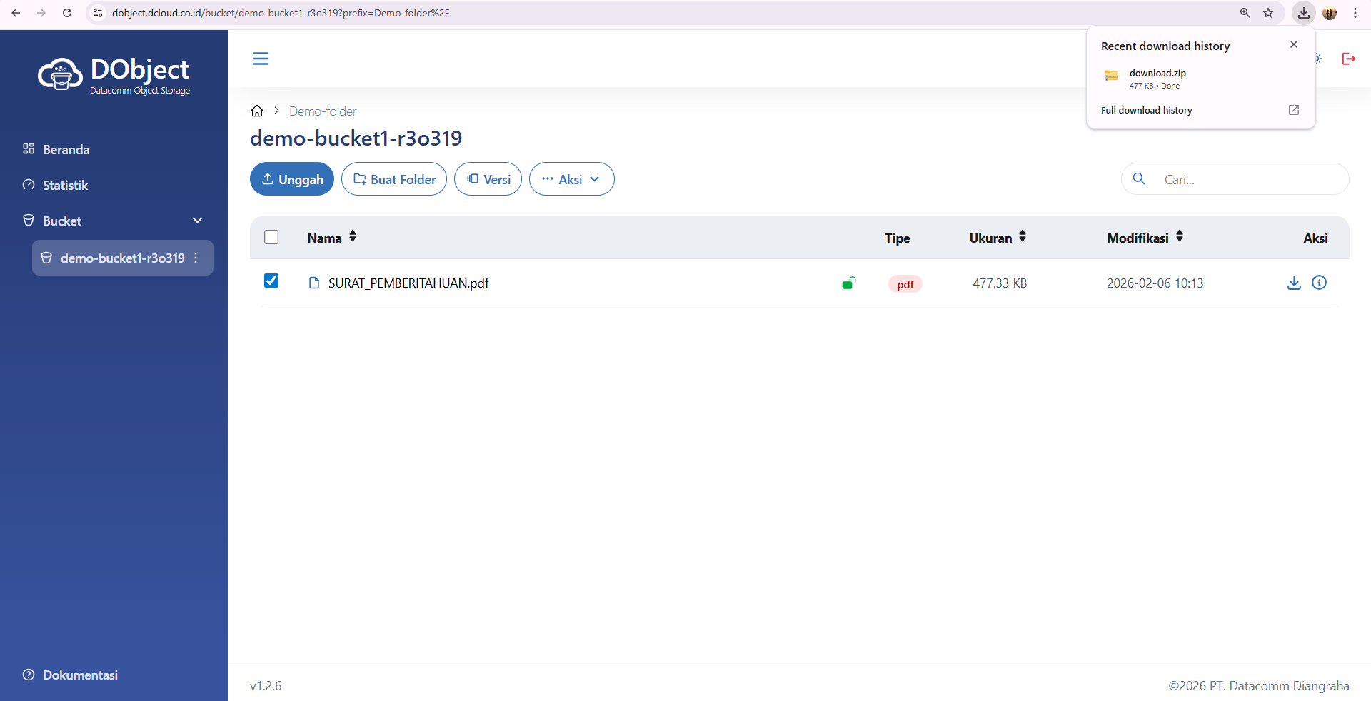 Halaman Detail Bucket - Anda dapat melakukan unduh dengan memberi tanda centang pada kotak disamping nama folder maupun berkas yang diinginkan. Kemudian tekan tombol Aksi, akan tampil halaman seperti dibawah ini.